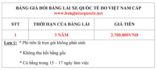 3. Bảng giá dịch vụ đổi bằng lái xe quốc tế IDP do Việt Nam cấp:
