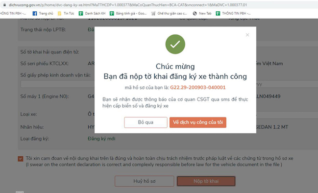 Sau khi hoàn thiện các bước trên, nhân viên đại lý bán ôtô tiếp tục hướng dẫn anh Phong vào mục đăng ký xe và khai vào tờ khai trực tuyến trên Cổng dịch vụ công trực tuyến. Thao tác này thực hiện trong vòng 5 phút và anh nhận được phản hồi với nội dung "Bạn đã nộp tờ khai thành công" kèm theo mã số đi cấp biển, đăng ký xe.