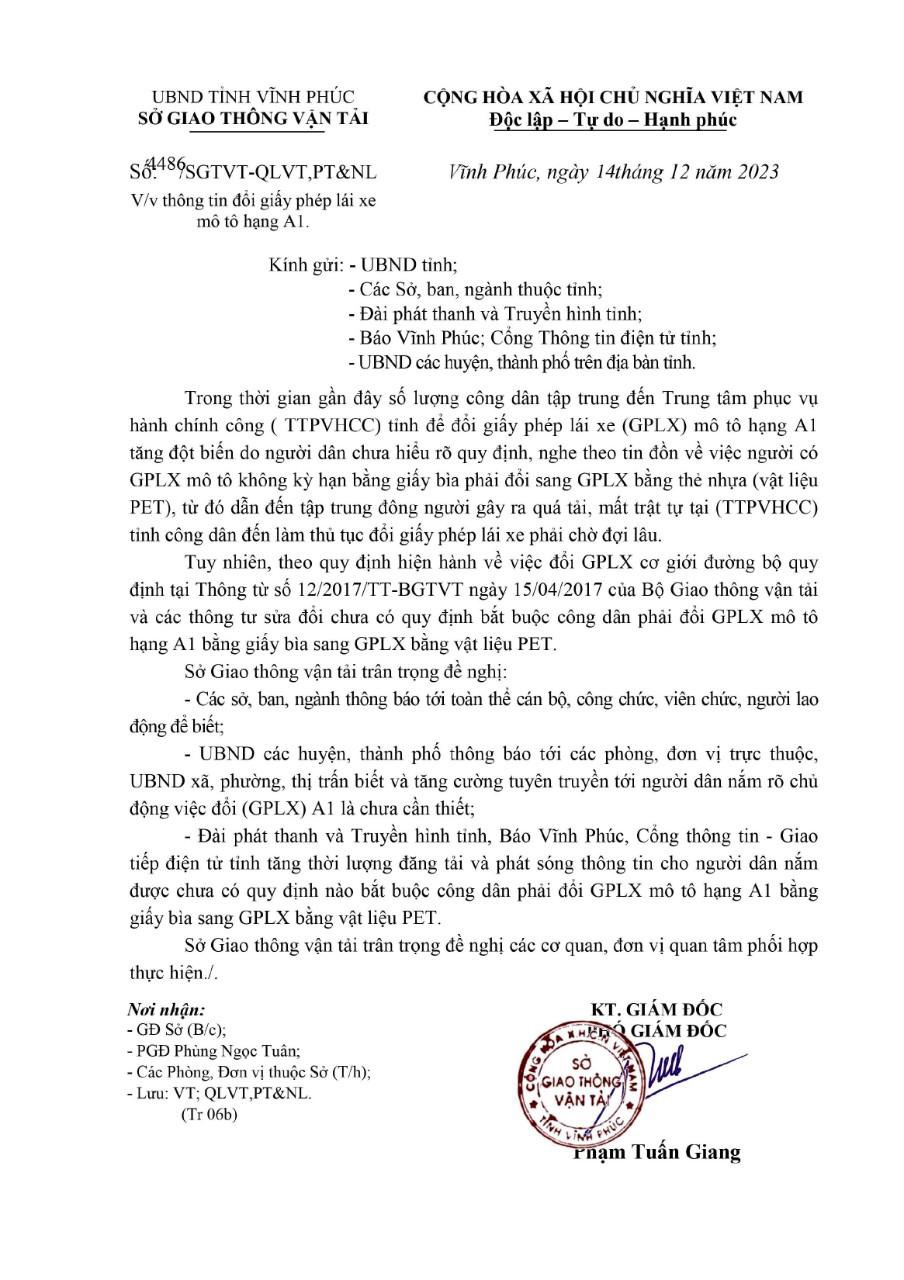 Thời gian gần đây, một số trang mạng xã hội đưa thông tin chưa đầy đủ và chính xác khiến người dân hiểu nhầm về quy định bắt buộc phải đổi GPLX mô tô không kỳ hạn (Hạng A1) từ vật liệu giấy bìa sang thẻ nhựa (PET). Ngày 14/12/2023, Sở Giao thông vận tải Vĩnh Phúc đã ban hành Văn bản 4486/SGTVT-QLVT,PT&NL khuyến cáo người dân không cần đổi GPLX hạng A1 từ vật liệu bìa giấy sang vật liệu PET trong trường hợp chưa cần thiết (GPLX còn mới, thông tin, hình ảnh đầy đủ, rõ ràng).